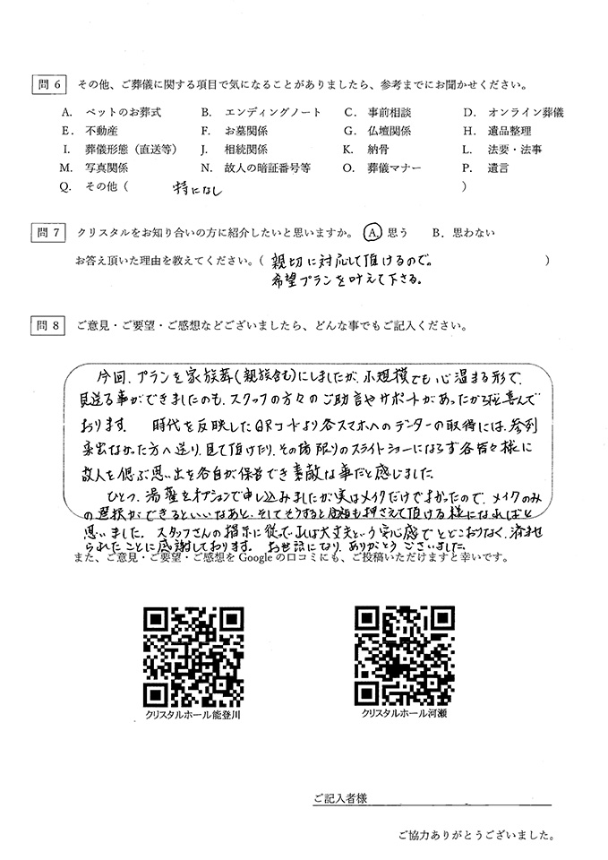 クリスタルホール 河瀬では、葬儀を終えられたご家族の方にアンケートにご協力いただき、より良いサービスの提供に努めております。